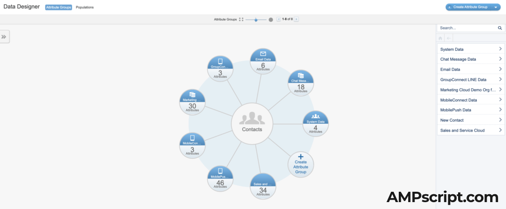 - In Contact Builder and under Data Designer, click the blue Create Attribute Group button on the top-right hand corner.